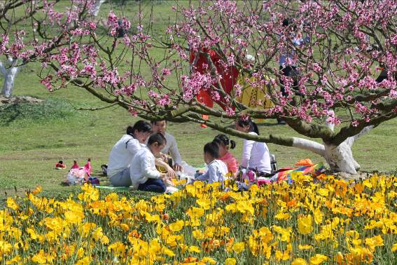 玩得累了,妈妈在桃花树下铺开毯子,家人围坐在一起,伴着和煦的暖阳度过美好的家庭时光。