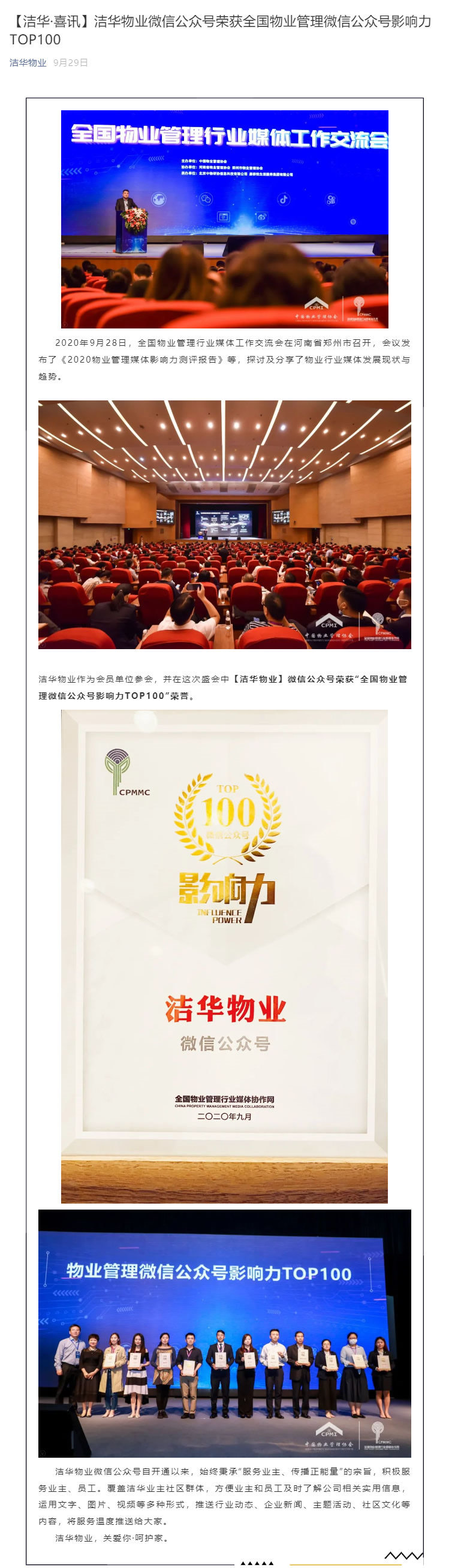 洁华物业作为会员单位参会,并在这次盛会中【洁华物业】微信公众号荣获“全国物业管理微信公众号影响力TOP100”荣誉。