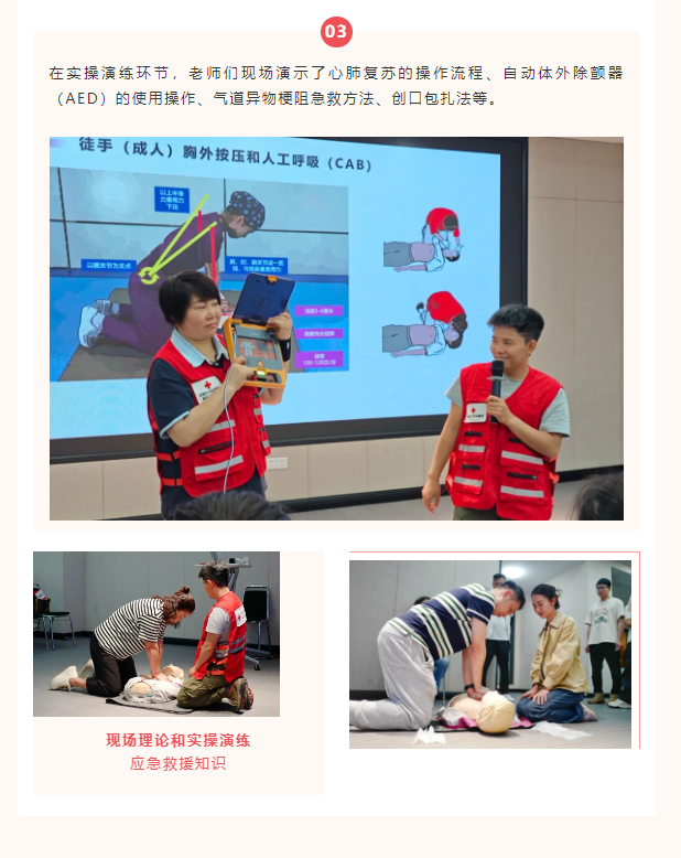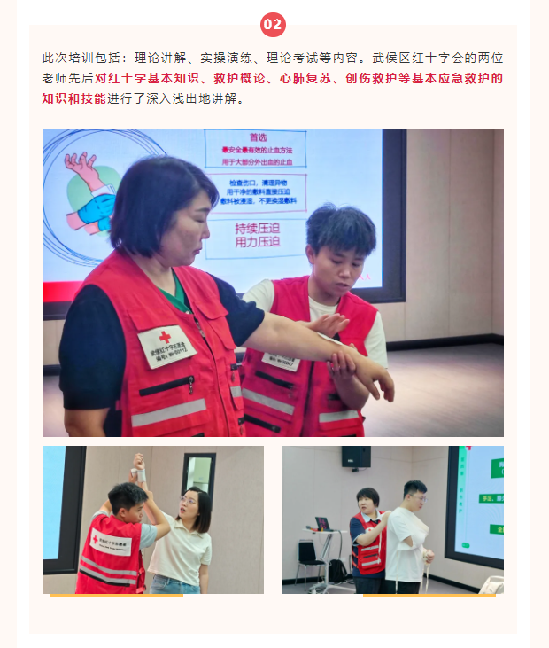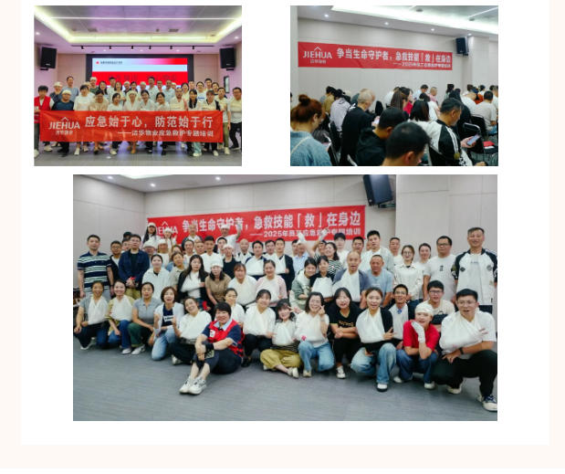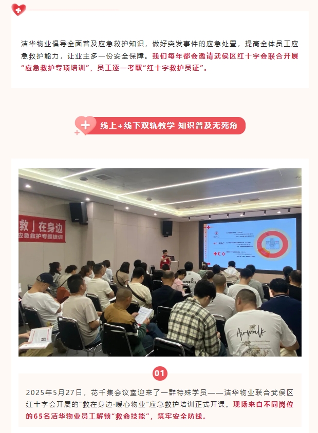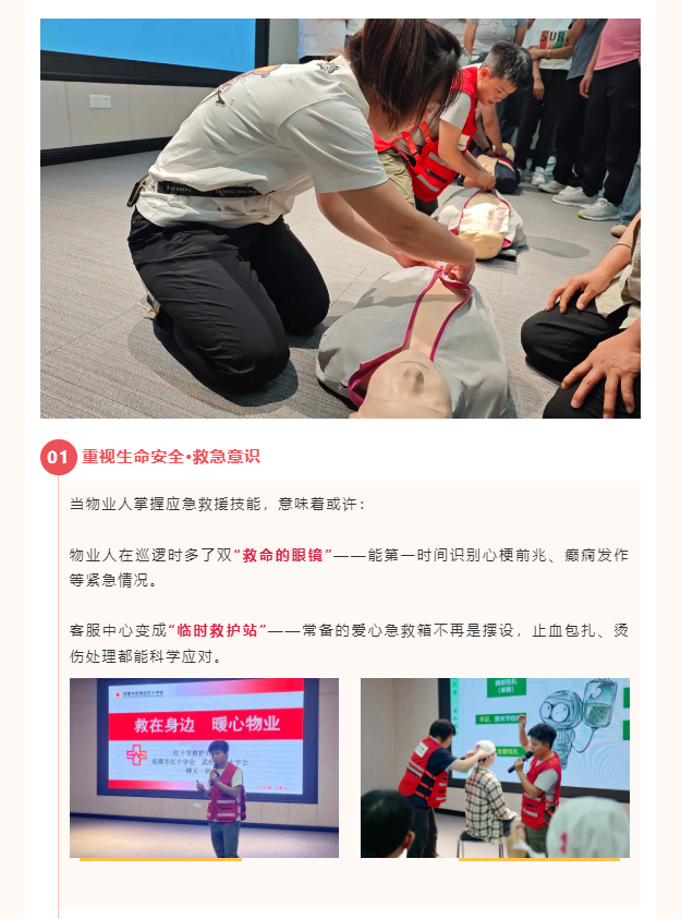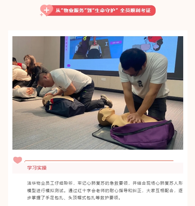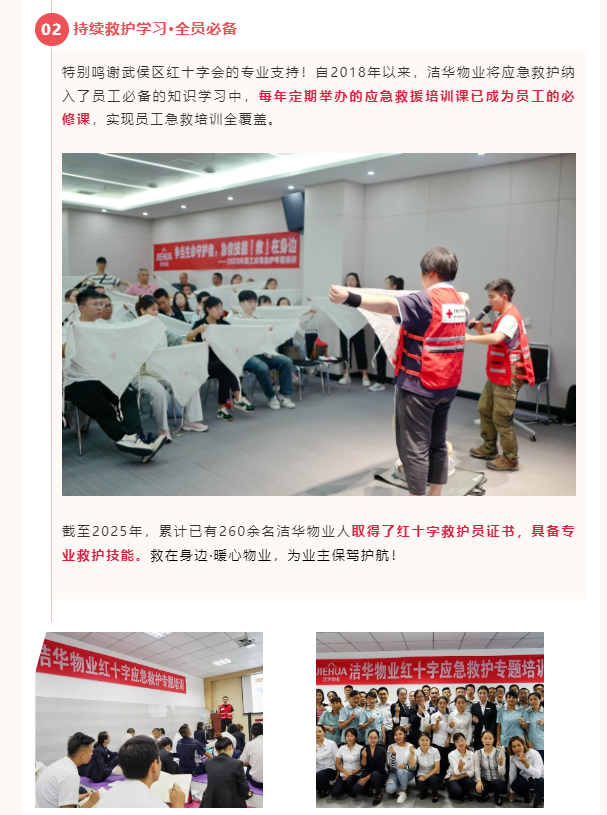 洁华物业倡导全面普及应急救护知识,做好突发事件的应急处置,提高全体员工应急救护能力,让业主多一份安全保障。我们每年都会邀请武侯区红十字会联合开展“应急救护专项培训”,员工逐一考取“红十字救护员证”。